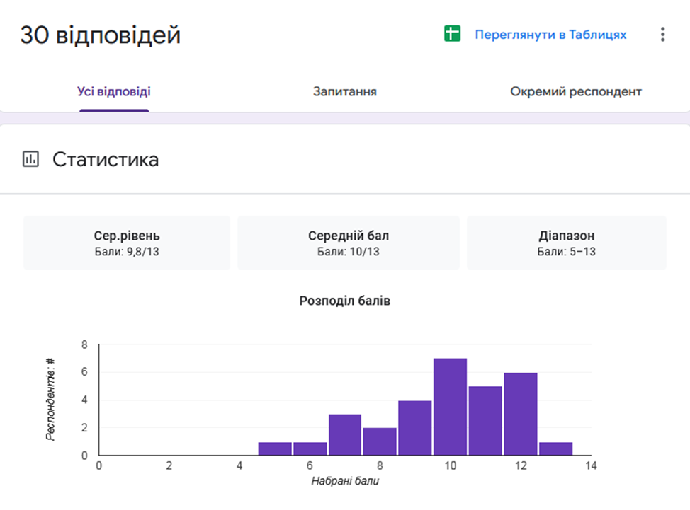 Тестування проведено за допомогою google-форми (13 питань-тестів).